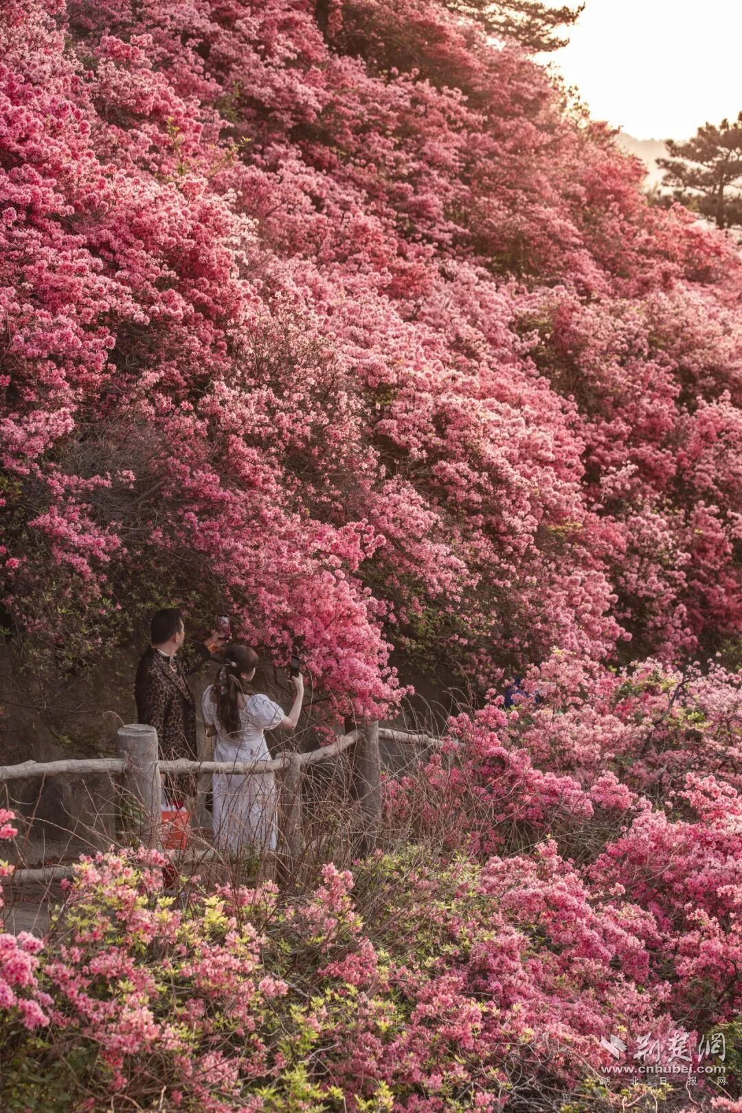木蘭云霧山擁有武漢最大的高山杜鵑群落,擁有映山紅、白鵑梅等7個品種的野生杜鵑,總面積超過萬畝。依托不同海拔形成的立體氣候,杜鵑花呈現(xiàn)梯次開放格局,賞花期長達(dá)50天,可持續(xù)至5月初。