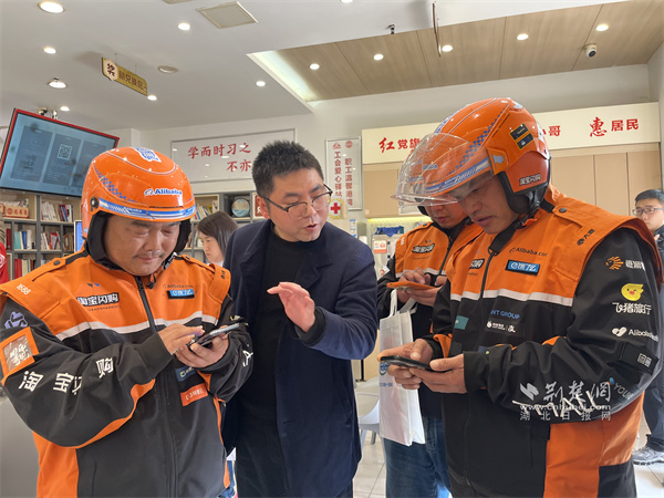 社保工作人員為騎手介紹靈活就業(yè)的個(gè)人養(yǎng)老保險(xiǎn)政策。 通訊員供圖