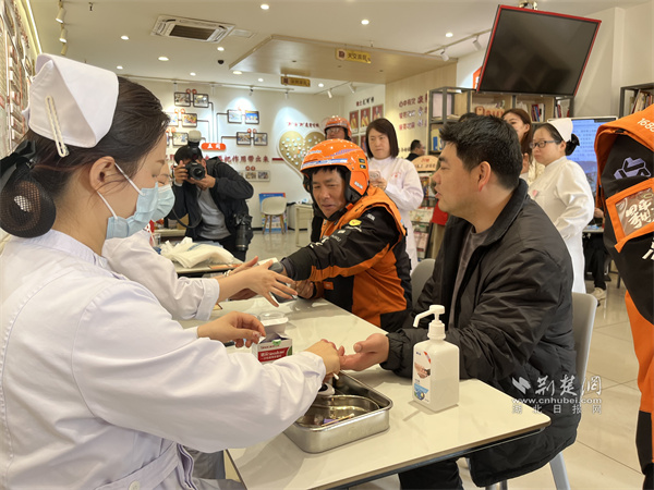 活動(dòng)特別設(shè)置自由提問與便民服務(wù)環(huán)節(jié),將服務(wù)窗口“零距離”前移。社保處工作人員一對一解讀新就業(yè)形態(tài)人員個(gè)人養(yǎng)老保險(xiǎn)政策;漢口銀行工作人員同步普及個(gè)人公積金政策,并開通社??ā凹磿r(shí)辦”綠色通道,騎手們可在咨詢間隙現(xiàn)場辦結(jié),切實(shí)踐行“數(shù)據(jù)多跑路,群眾少跑腿”的服務(wù)理念。同時(shí),武漢市第三醫(yī)院醫(yī)療隊(duì)將義診服務(wù)送進(jìn)驛站,為到場騎手逐一測量血壓、檢測血糖,結(jié)合戶外作業(yè)特點(diǎn)送上針對性健康指導(dǎo)。