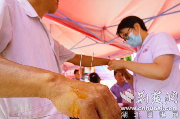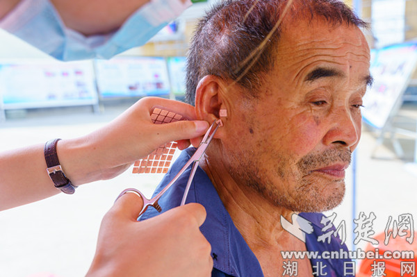 義診現(xiàn)場(chǎng),除了心電圖、血糖、血壓等常規(guī)檢查外,還首次增加了肺功能檢查、貼三伏貼、針灸、拔罐、刮痧等醫(yī)療項(xiàng)目,323攻堅(jiān)行動(dòng)宣傳冊(cè)也發(fā)到每位群眾的手中。