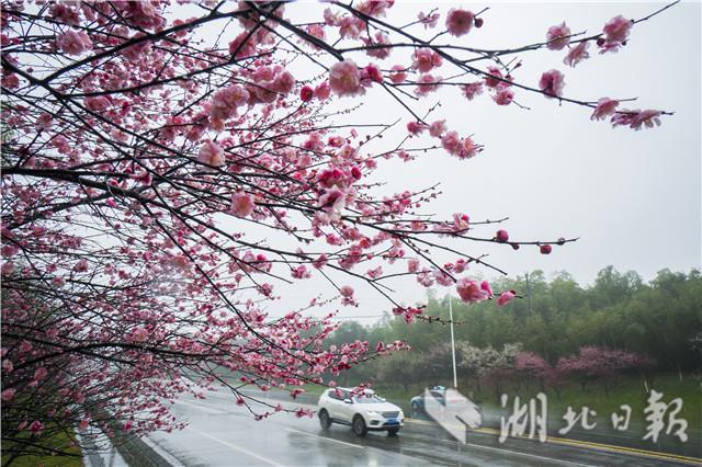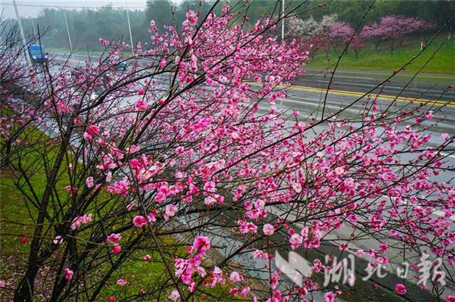 2月13日,咸寧市咸安區(qū)桂鄉(xiāng)大道兩旁的紅梅花在風(fēng)雨中含笑迎賓。眼下,隆冬尚未消退,風(fēng)雨交夾,寒氣逼人。位于湖北省南部的咸寧市,紅梅花在枝頭綻放,預(yù)示著春天的腳步越來越近了。(湖北日報全媒記者 陳勇 攝)