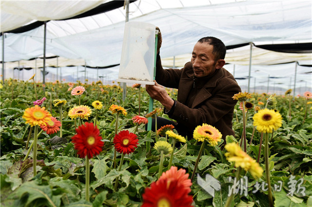 2月20日,湖北省通城縣石南鎮(zhèn)賽公村非洲菊種植專業(yè)合作社社員在管護非洲菊。