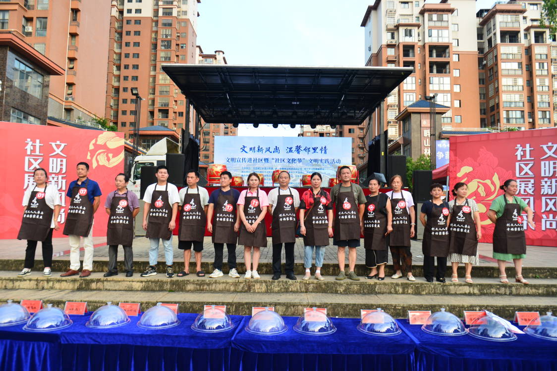 涼拌牛肉、盤龍草魚、海鮮粉絲煲、青椒小炒肉……舞臺(tái)下,居民有序排隊(duì)領(lǐng)取參賽美食,一邊品嘗一邊交流做菜心得,歡聲笑語充斥著整個(gè)活動(dòng)現(xiàn)場。