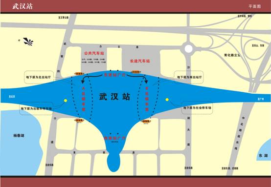 武漢站的設(shè)計采用四層的立體結(jié)構(gòu)。最上面一層為候車區(qū)和售票區(qū),下面一層為乘車區(qū),檢票后,旅客可以乘電梯直接下到動車旁。再下面為地面層,用于旅客出站以及社會車輛停車。最下面一層為地下層,為地鐵準(zhǔn)備,目前正在施工中。