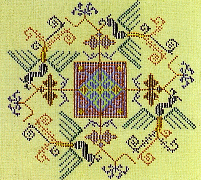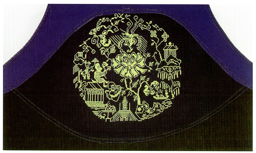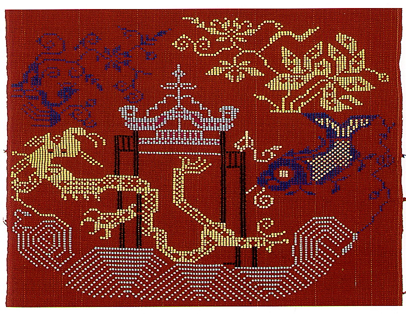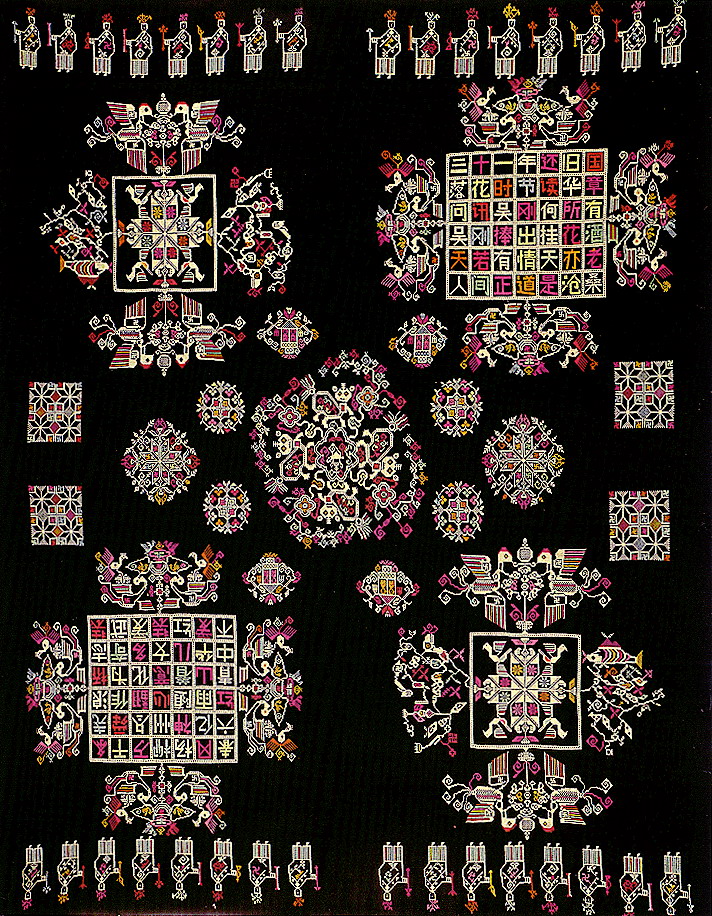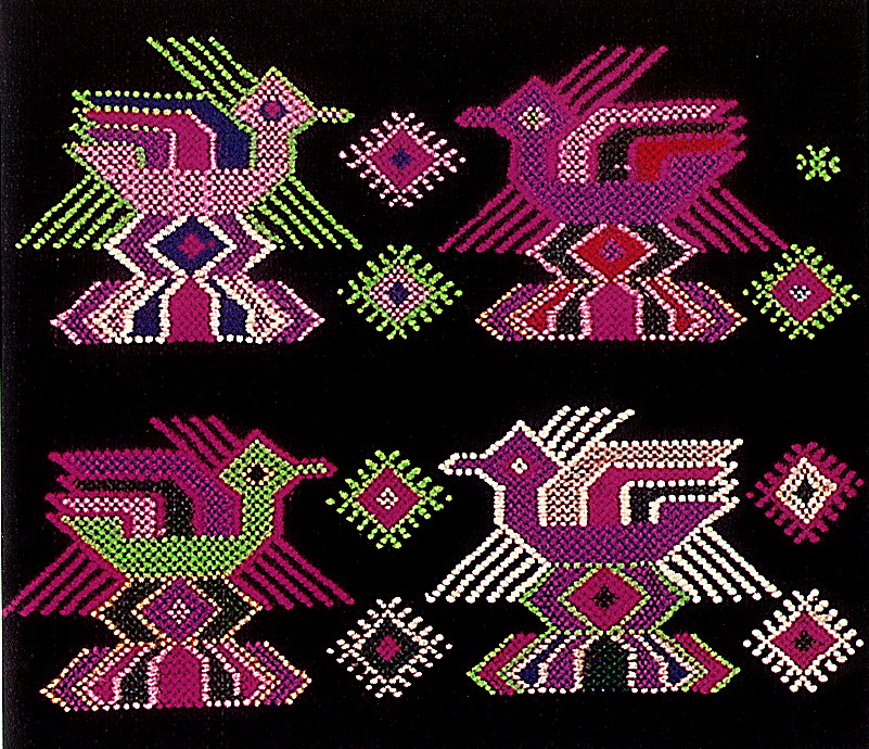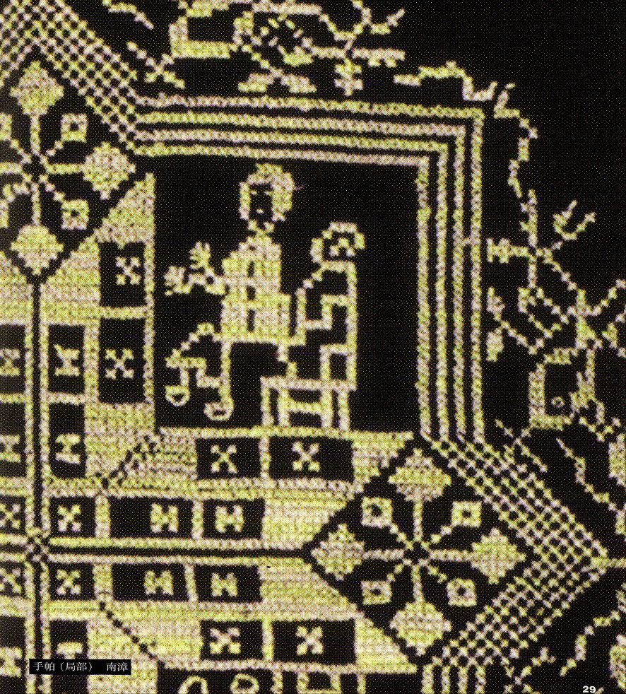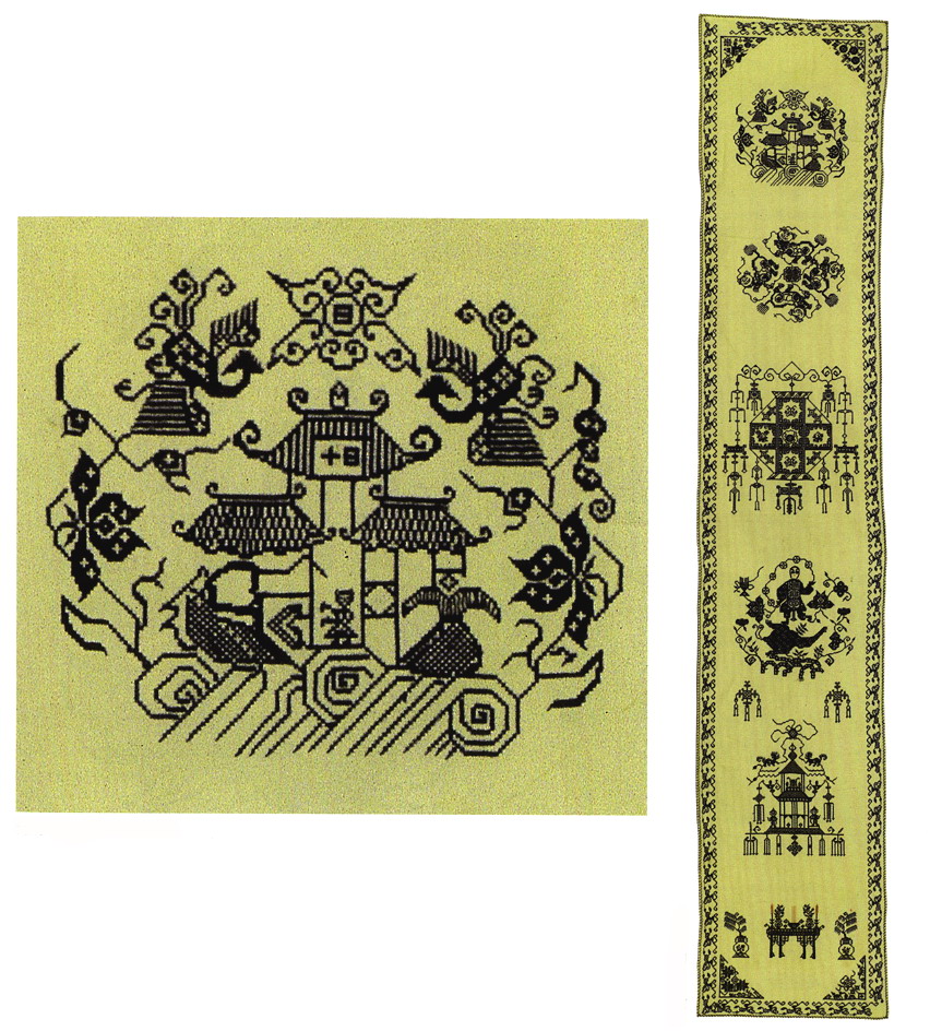 挑花針?lè)ㄓ衅教艋ê褪只▋煞N,即在平布上面依紗眼用繡花針扣上十字形,然后以此為骨架,填置上多種需要花紋,采取反面挑花正面看手法,其優(yōu)點(diǎn)有二:一是保持清潔;二是便于打結(jié)。構(gòu)圖多是幾何圖形,也有動(dòng)植物的幾何圖案。其結(jié)構(gòu)主要有對(duì)稱(chēng)式、交叉式、二方連續(xù)式、斜菱形、單獨(dú)紋樣等等。圖案花紋既規(guī)整而又變化多姿,給人以舒暢愉快的感覺(jué)。