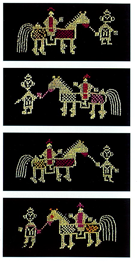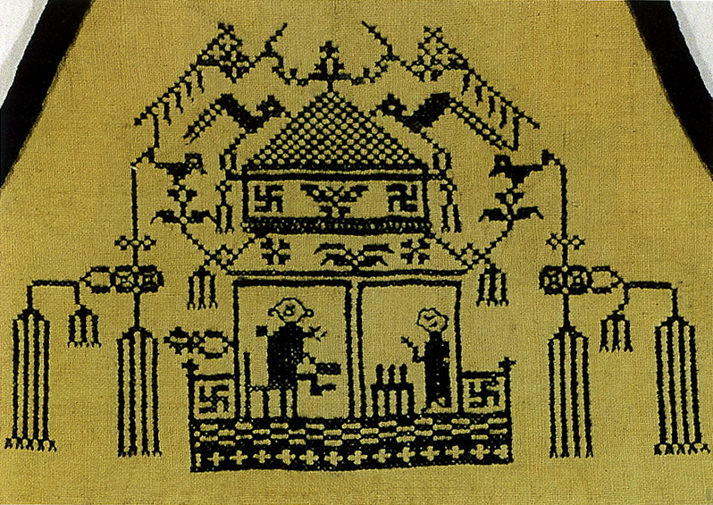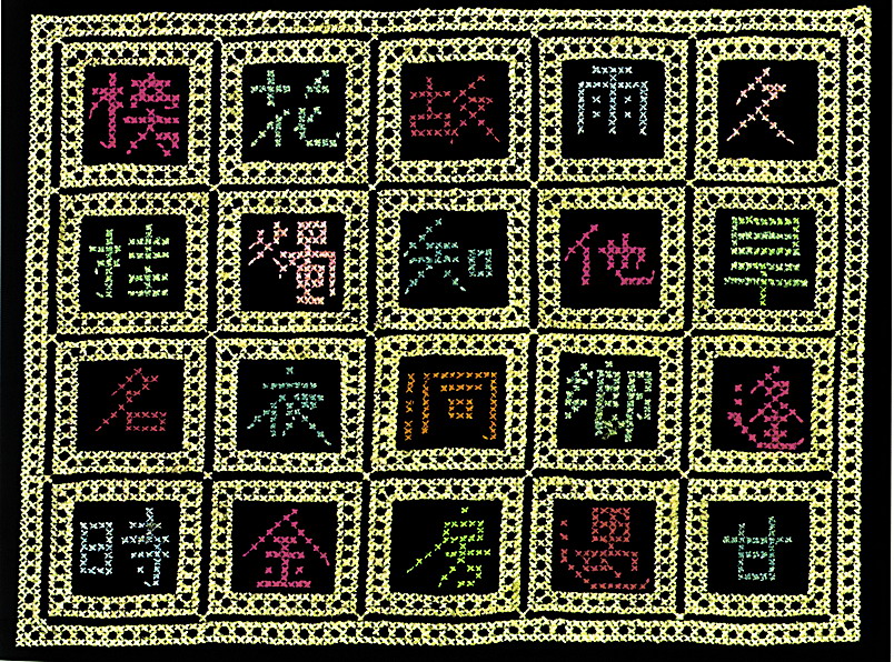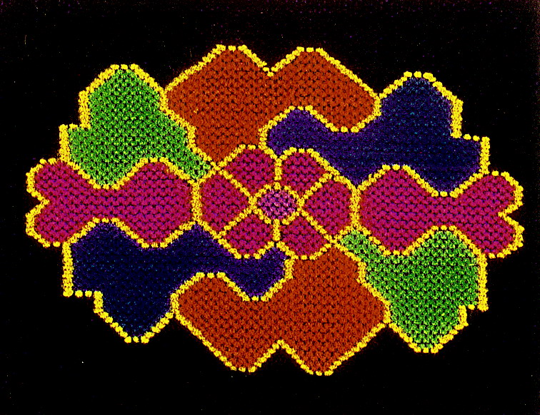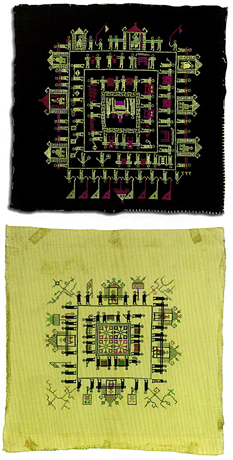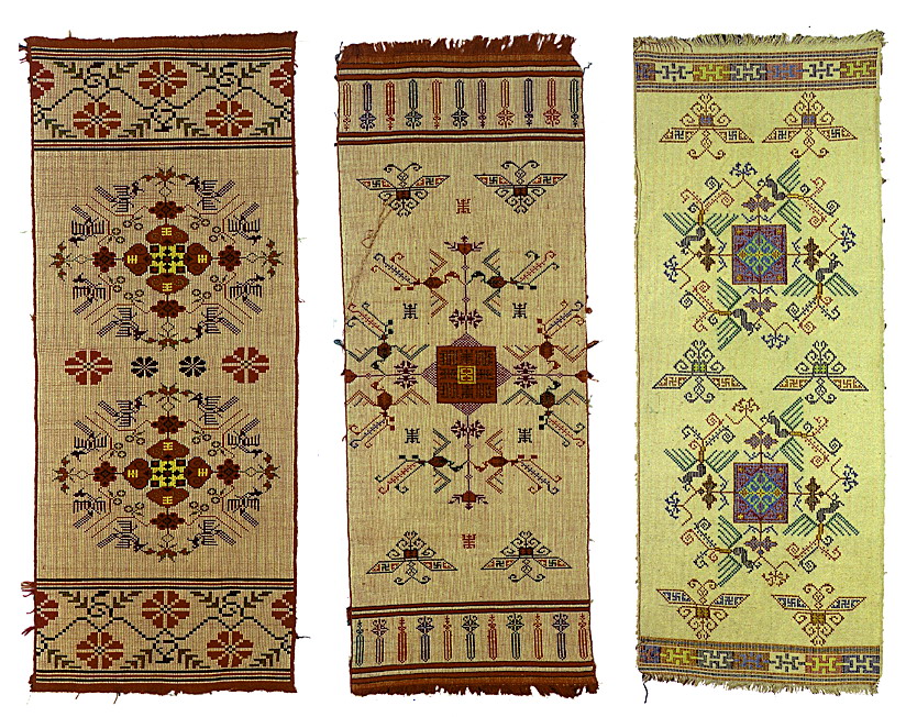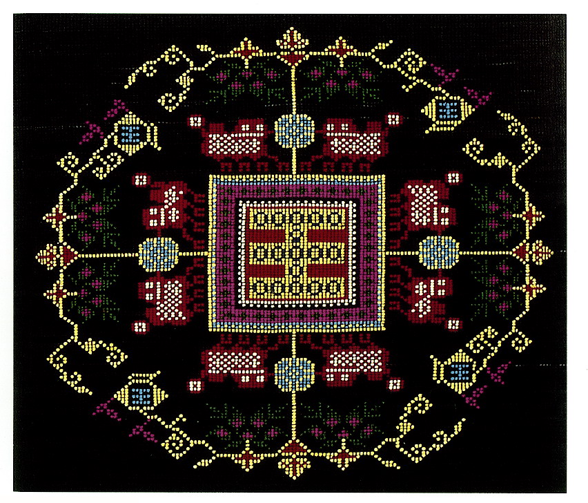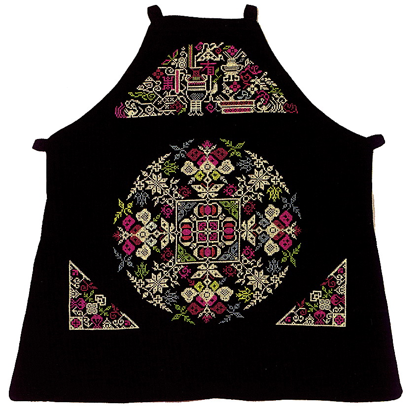 挑花針?lè)ㄓ衅教艋ê褪只▋煞N,即在平布上面依紗眼用繡花針扣上十字形,然后以此為骨架,填置上多種需要花紋,采取反面挑花正面看手法,其優(yōu)點(diǎn)有二:一是保持清潔;二是便于打結(jié)。構(gòu)圖多是幾何圖形,也有動(dòng)植物的幾何圖案。其結(jié)構(gòu)主要有對(duì)稱(chēng)式、交叉式、二方連續(xù)式、斜菱形、單獨(dú)紋樣等等。圖案花紋既規(guī)整而又變化多姿,給人以舒暢愉快的感覺(jué)。