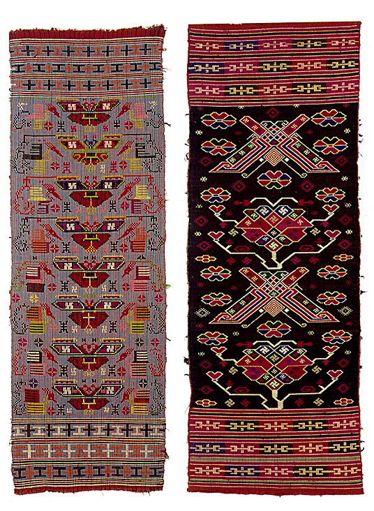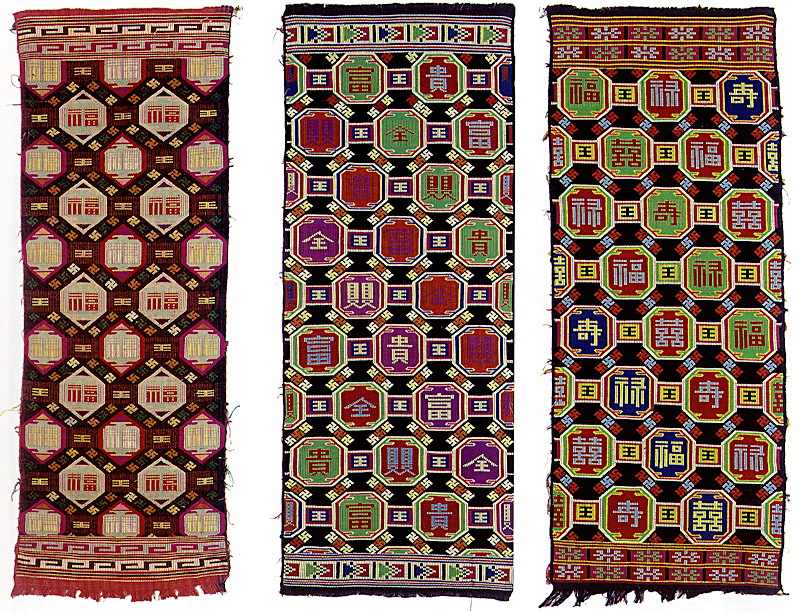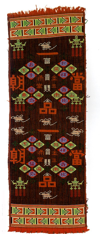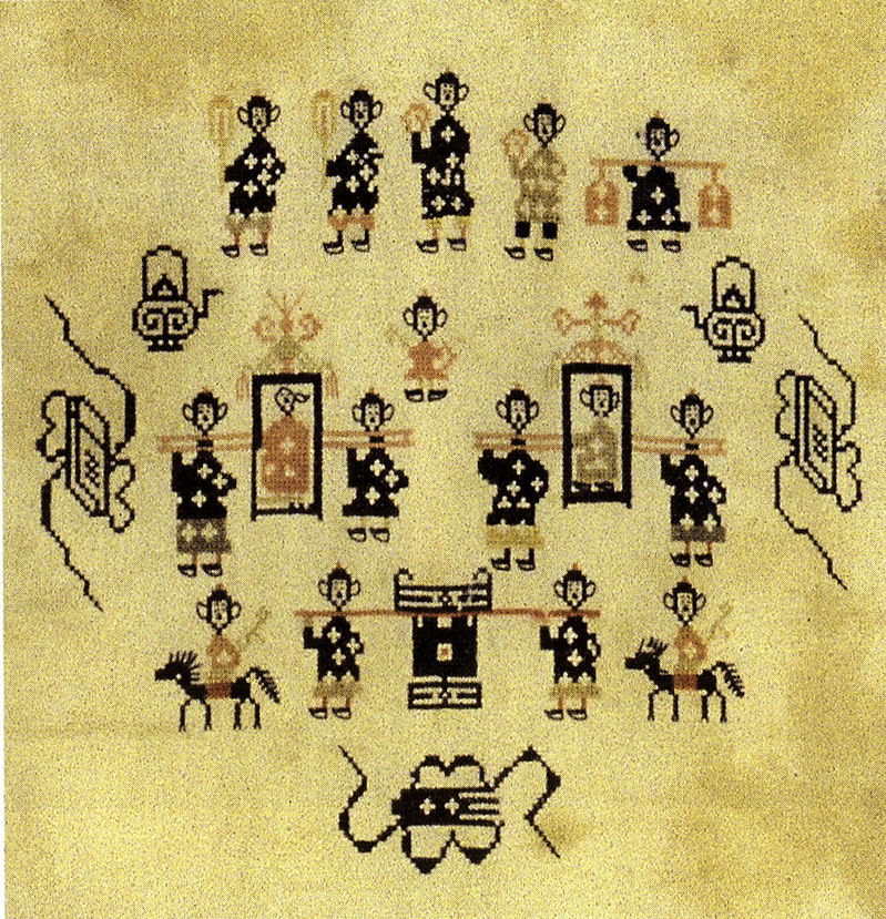 土錦以“通以斷緯”為編織手段,受巴楚文化的影響:1、紋飾既抽象又有形,土錦圖案來(lái)自對(duì)大自然的感受,身邊的物象也是編織者寄情抒懷的選擇,不論是對(duì)動(dòng)物或用具,還是對(duì)天象星座,都能運(yùn)用夸張變形的手法,達(dá)到抽象裝飾美的效果。2、色彩上注重原色與復(fù)色的互補(bǔ):運(yùn)用紅、黃、藍(lán)三色,并延伸以赤、黃、青、白、黑為五正色。